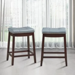 Tangkula Set Of 4 Saddle Bar Stools Backless Nailhead Counter Stool With Grey Cushions Coffee/White