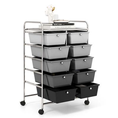 Whether you’re a teacher looking for a way to store and organize classroom supplies, an office worker in need of extra storage for paperwork or a homeowner wanting to declutter your space, the 10-drawer rolling storage cart is a practical and stylish solution!This utility cart features 1 mesh top platform and 10 spacious drawers, allowing you to store and organize a variety of items such as tools, scrapbook paper, office supplies, or craft materials. And The drawers are also removable, making it convenient to take them out and organize your supplies even more efficiently. If you wanna move it, just grab the metal handles and push it through 4 universal wheels.