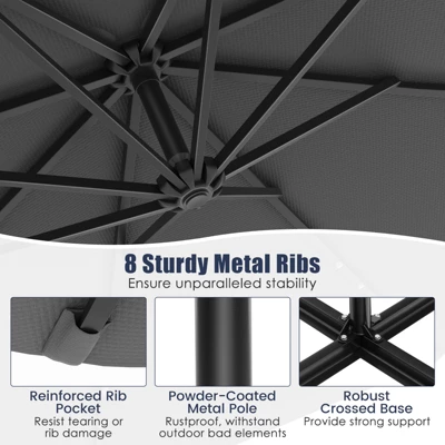 Experience comfort and tranquility in your outdoor space with our solar-powered offset umbrella! Featuring 40 LED lights powered by a solar panel, this hanging umbrella creates a warm and inviting atmosphere in dark settings. The solar panel fully charges in 4 hours under sunlight to provide 7 hours of illumination at night. With 8 reinforced heavy-duty ribs and a stable cross base, this cantilever umbrella is durable and secure. The polyester fabric cover shields you from sunlight and light rain, while the tilt adjustment allows easy alignment with the sun’s movement for optimal shading. The crank open mechanism ensures effortless operation, allowing you to quickly achieve perfect shade wherever you desire.