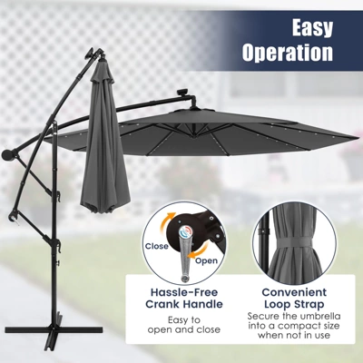 - Bright Solar Powered LED Lights: LED lights installed on the patio umbrella allow you to enjoy a relaxing evening without restrictions on any occasion. Powered by solar panels, this offset umbrella can save energy during daytime and keep the lights on at night. You can control the LED light by the switch on the ribs.