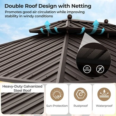- Double Roof Design & Spacious Space: The hardtop gazebo features a double roof design with netting, which promotes good air circulation while improving stability in windy conditions. Besides, it measures 400 x 300 x 283 cm/13 x 10 x 9.3 ft (L x W x H), providing large space for the outdoor BBQ, dining, friends party, family gathering, or daily relaxation.