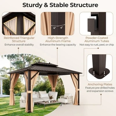 The Perfect Outdoor Structure to Elevate Your Outdoor Living Experience!The large double-top hardtop gazebo measures 13 x 10 x 9.3 ft (W x D x H), offering the perfect setting for outdoor gatherings, whether it’s a family barbecue or a garden party. Thanks to the heavy-duty galvanized steel roof, this gazebo can withstand various weather conditions, offering good sun protection, rain resistance, and wind resistance. And it can load up to 880 lbs of snow. Moreover, the metal gazebo is supported by a high-strength aluminum frame, enhancing the bearing capacity of the gazebo and better safety. Also, there are anchoring plates and expansion screws to firmly fix it on the ground.