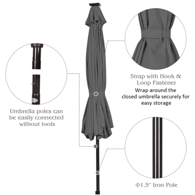 - 【Multi-functional Applications】Our patio umbrellas can provide shade during the day and light up the party at night. It is suitable for residential and commercial locations, as well as any outdoor area such as garden, poolside and beach. When not in use, the sewn-in hook and loop fastener straps can easily wrap the closed umbrella for storage.