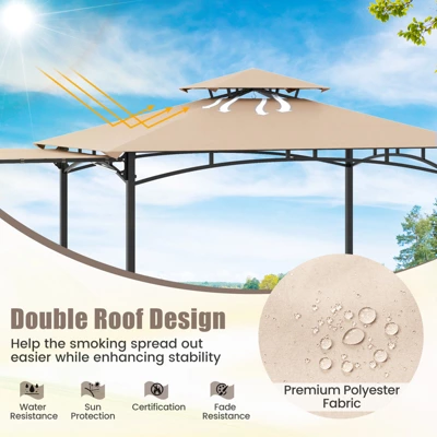 Turn Your Outdoor Grilling Sessions into a Luxurious Affair!Our grill gazebo with side awning measures 11 x 5 x 8.2 ft (L x W x H), offering ample shading space for enjoying BBQ or outdoor dining in your yard, pool area, garden, or deck. The awning supported by hydraulic rods is easy to open and close. And there are bar counters with 2 shelves and several hooks, offering extra storage space for your grilling essentials. Other than that, it boasts sun-protective and flame-resistant polyester canopy and rustproof metal frame, which is built to withstand various weather conditions, ensuring long-term outdoor use. And there is a double-tiered top and stake-fixed plates, making the gazebo more stable.