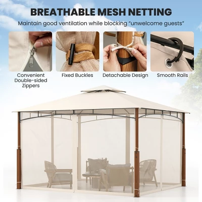Transform Your Outdoor Space into a Luxurious Retreat!Our 12 x 10 ft outdoor gazebo provides a 120 sq.ft large footprint, which is ideal for enjoying outdoor entertainment with your family and friends. Supported by thick metal columns and firmly secured by anchored plates, our tent ensures better sturdiness and stability in various weather conditions. For enhanced comfort, it is equipped with detachable mesh netting that maintains good ventilation while blocking “unwelcome guests”. And it adopts a double-roof polyester canopy enhances ventilation while providing exceptional protection against outdoor elements. More than that, thanks to its simple connections, setting up an outdoor gazebo is easier than before.