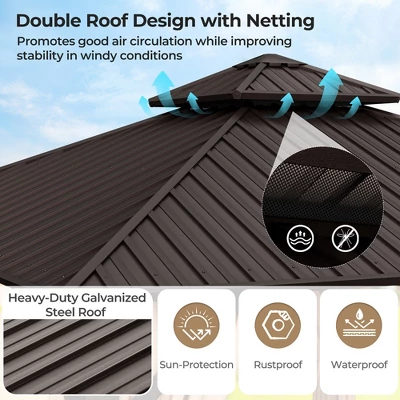 The Perfect Outdoor Structure to Elevate Your Outdoor Living Experience!The large double-top hardtop gazebo measures 12 x 12 x 10 ft (W x D x H), which can not only be a perfect shelter for outdoor parties and events but also a cozy retreat for relaxing in your backyard. Thanks to the heavy-duty galvanized steel roof, this gazebo can withstand various weather conditions, offering good sun protection, rain resistance, and wind resistance. And it can load up to 1000 lbs of snow. Also, the aluminum frame and 4 reinforced anchoring plates with expansion screw fixation add more durability and safety. The double-roof design provides excellent insulation and superior ventilation.