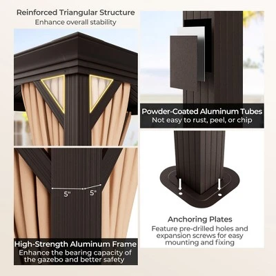 - Sturdy & Stable Structure: The double-top gazebo is built with a high-strength aluminum frame and reinforced triangular structures, providing strong support and ensuring good sturdiness. And there exist anchoring plates with pre-drilled holes and expansion screws for easy mounting and fixing, adding extra stability.