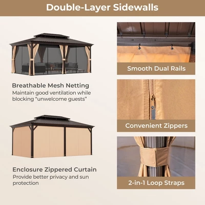 - Double-Layer Sidewalls: The permanent patio gazebo adopts a dual-rail design to hang the netting and curtains for smooth sliding. The inner breathable netting helps maintain good ventilation while blocking “unwelcome guests”. And the outer enclosure zippered curtain provides better privacy and sun protection while resisting dust and wind.