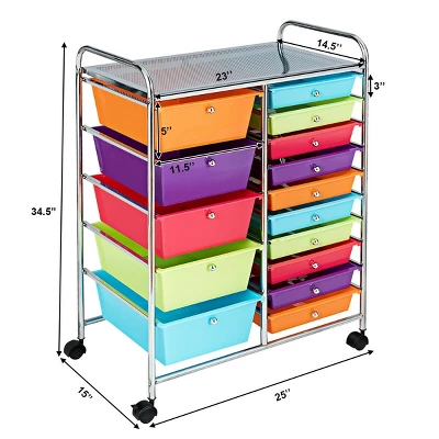 A spacious storage cart to hold many items at your home! It can not only serve as kitchen cart, but also a file consolidation helper! 15 large in two different size, a great solution for your different storage needs. You can use it for daily essentials, books, kid supplies, and more. Opaque multicolor drawers are not only help for classify but good for privacy protection. Its high-quality material and elaborate craftsmanship ensure its endurance. Besides, the bottom has 4 premium casters to ensure effortless mobility. The more important is 2 brakes which secure the cart firmly when it is not in use.