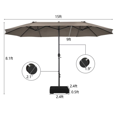 - Extra-Large Shade Area: This 15 ft wide patio umbrella features a double-sided design, which gives you maximum shelter that brings you double shades for your outside enjoyment. Additionally, this patio umbrella with large shade is great for garden, backyard, poolside and beach.