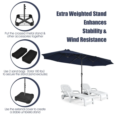 Make the most of your leisure time with family and friends while staying shaded under our twin patio umbrella! Measuring 15ft x 9ft, this double-sided umbrella provides ample shade for gatherings, ensuring everyone can relax and socialize comfortably under the sun. The sturdy metal structure and sun-protective fabric guarantee durability and effective sun protection. The umbrella’s base features a cross metal frame, 2 sand bags (each filled bag weighing 90lbs), and an external cover, eliminating the need for an additional base purchase. Additionally, the user-friendly crank mechanism allows for effortless opening and closing by simply rotating the crank handle.