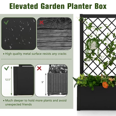 - Wide Diamond Lattice Trellis: The planter bed features a 2-in-1 design for scientific planting. Its top trellis of 25″ x 37″ (L x W) offers ample space for climbing plants, like vines, and other hanging decorations to make your garden more diverse.