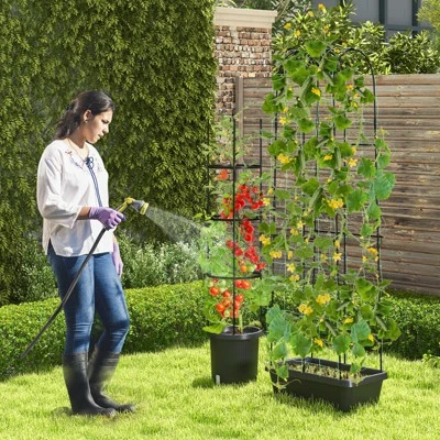 Our 2-pack garden trellis includes a 58.5” tomato cage and a 71” cucumber trellis, providing strong support for various climbing plants to grow upward, including vegetables, fruits, and flowers. And 2 trellises both can be adjusted in 3 heights, enabling them to accommodate the growth needs of various climbing plants. Other than that, it includes 2 planter boxes on the bottom, therefore you can easily move the trellises anywhere you want. And the self-priming irrigation system could keep your plants hydrated and thriving (round Flower Pot features water indicator level). Besides, the poles are secured by sturdy sure-clips, thus plants could safely grow and climb up. Other than that, it is equipped with 2 types of functional plant clips and plant ties, which can guide the growing direction of plants while preventing them from sprawling and tangling. Transform your garden into a flourishing oasis with ease and efficiency.