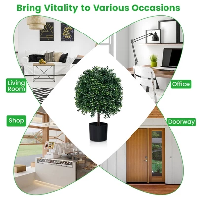 Add greenery to your space with our 2 pack boxwood topiary trees!The 2 pack artificial boxwood topiary tree is designed with mini white fruits, dense leaves, and highly simulated grass that exudes vibrancy and charm. Moreover, the faux trunk with leave pattern adds a touch of sophistication. Crafted from premium PE material, the leaves of these artificial topiary trees are odorless and evergreen.The flower pot is filled with cement for enhanced stability, ensuring that your bushes stay upright at all times.