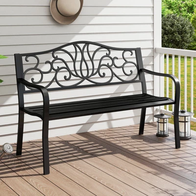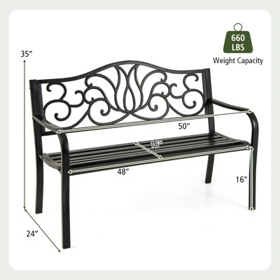 The ergonomic outdoor bench is the perfect blend of elegance, durability, and comfort.Crafted meticulously from heavy-duty spray metal and cast metal, it is sturdy and an enduring investment for your open-air spaces. Designed to support up to 660 lbs, the outdoor bench can effortlessly accommodate 2-3 people, ideal for family gatherings on your balcony, serene moments in the garden, or socializing in park settings. The ergonomic 105 degree slanted backrest, coupled with a smoothly curved seat and armrests, ensures hours of relaxation. Moreover, the garden bench features beautiful floral patterns that enhance its visual appeal and complement landscapes. Plus, the slatted surface offers the practical benefit of quick drying after rain, making maintenance practically effortless.