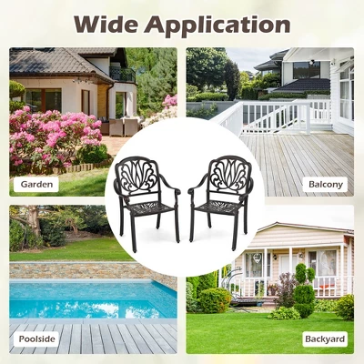 Enjoy your outdoor relaxing time with this cast aluminum patio chair set! These 2 patio armchairs are made of all cast aluminum, making it weatherproof and fade resistant, ideal for outdoor use. Curved backrests and wide seats are ergonomically designed to provide you with a comfortable sitting experience, and it also comes with curved armrests at a proper height to relax your arms. This garden chair set can be matched with your patio table, perfect for placing in your garden, patio, balcony and more, allowing you to sit down to chat with your friends and family and relax yourself. Simply stack these patio armchairs when not in use without taking up too much space.