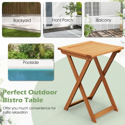 Elevate your outdoor space with this high-quality folding bistro table, designed for convenient patio relaxation. Constructed from solid hardwood, this table is durable and sturdy, with a burr-free natural wood structure that adds elegance and charm. When not in use, it easily folds down to a compact size for convenient storage and portability. Safety is a priority with the fixing device under the tabletop, preventing accidental folding. The slatted tabletop design effectively prevents water accumulation, while the X-shaped structure and reinforced crossbar ensure excellent stability. The versatile natural wood color makes this outdoor bistro table a perfect addition to any outdoor setting.