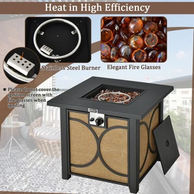 Featuring high-efficiency heating with 50,000 BTU heat output, the fire table offers you endless warmness in cold days. And you can remove or cover the lid for double use. The propane gas fire pit is available for 20 lbs standard propane gas tank which is not included. And the door with handle and magnetic door catch makes it easy to take in or out the tank. Moreover, the premium ignition panel and gas regulator ensure convenient and safe operation. And the fire glasses are included for more appealing flame effects. Last but not least, the PVC cover is useful to protect the fire table in outdoor occasions.
