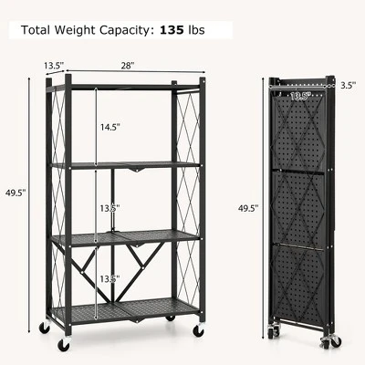Experience the ultimate storage solution with the folding metal storage rack.It features 4 spacious shelves with ample spacing for easy access to your items. Moreover, the 4 universal wheels (2 with brakes) enhance mobility and stability. With heavy-duty metal, the organizer rack is built to last and withstands the rigors of heavy use. The adaptability makes it perfect for a variety of settings, from the kitchen to the garage. Plus, when not in use, simply fold and store the slim shelving unit in narrow spaces.