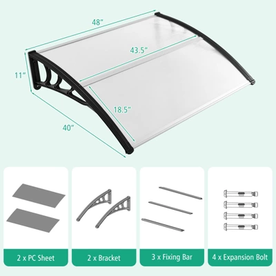 Introducing our newly designed patio awning canopy. This canopy not only enhances the modern aesthetic of your home but also provides protection for your windows and doors against sun, rain, and other outdoor elements. Crafted from premium PC sheets, it is weather-resistant and long-lasting. The anti-UV layer offers enhanced defense against harmful UV rays. In addition, the ABS brackets and aluminum bars ensure robust and long-lasting support. This awning can be effortlessly mounted on brick, wood, or concrete walls, making it suitable for both residential and commercial settings. Elevate your living space with this stylish window awning!