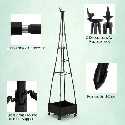 Our raised garden bed with trellis is a perfect solution for climbing plants to grow!Crafted with PP material and PE-coated metal tubes, the elevated growing box kit ensures plant safety while offering durability and weather resistance. The sturdy construction ensures steadfast support for heavy plants. Also, the garden obelisk trellis will offer vertical space for climbing plants to flourish. As the planter box features a reservoir, you can bid farewell to the tedious chore of frequent watering. To prevent water stagnation, the planter bed comes with drainage holes. The tomato cage planter is equipped with 4 universal wheels, allowing for effortless mobility to any location. Setting up the tall plant support is a breeze with detailed instructions.
