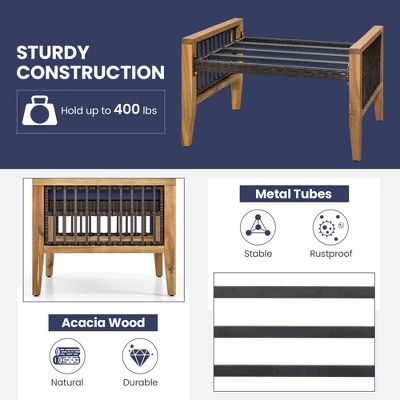Make outdoor leisure time more comfortable with our 2-piece outdoor patio ottomans! Designed with your comfort in mind, these outdoor footrests with thickened cushions not only allow you to sink into relaxation as you prop your feet up on them but also transform these ottomans into additional seating for different needs. No matter how you use them, the selected materials (solid acacia wood, anti-rust metal tubes and colorfast mix brown PE rattan) make these patio footstools stable and long-lasting to use.