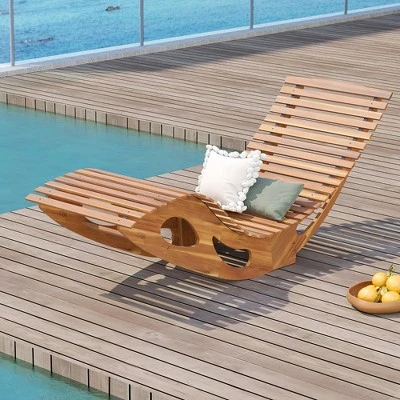 Elevate your outdoor relaxation with this premium acacia wood patio rocking lounger, combining durability with natural charm that seamlessly blends into any outdoor setting. This rocking lounger is crafted from wear-resistant acacia wood with reinforced crossbar for extra stability. The curved slatted seat offers you an immersive, breathable seating experience. Moreover, you can enjoy the smooth, safe rocking motion with bottom stoppers for added security. Ideal for poolside or backyard, this rocking chaise lounge promises an elegant addition to your outdoor space, inviting you to unwind in style and comfort.