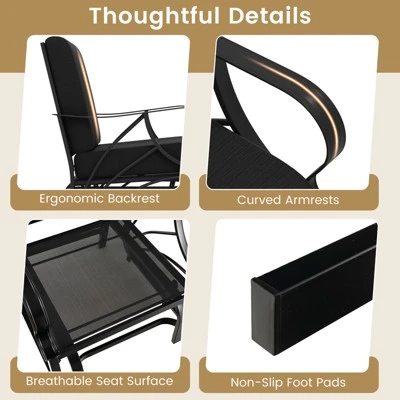 - Designed with Care: This versatile glider seamlessly blends functionality and style. Its thoughtful details, including an ergonomic backrest, breathable seat surface and curved armrests, ensure optimal comfort while adding a touch of elegance to any outdoor space.