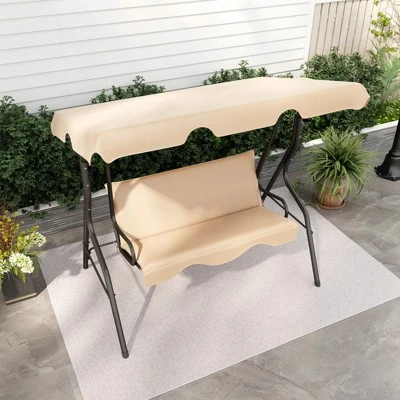 Enjoy serene moments with our 3-seat porch swing seat, designed to comfortably accommodate 2 adults and 1 child.This outdoor swing features a spacious seat with a removable cushion, tilted backrest, and ergonomic armrests, so comfort is at the forefront of its design. Moreover, the adjustable canopy shields you from the sun, while the sturdy A-shaped metal structure and anti-slip foot pads ensure stability and safety. The canopy’s polyester fabric is sun-proof and waterproof, making the swing chair a lasting addition to any outdoor space, such as a garden, backyard, porch and so on. Enjoy leisure time with your family!
