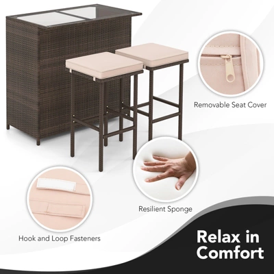 Cheers to comfort, style and endless summer nights with our 3-piece PE rattan patio bar set.Crafted with hand-woven PE wicker and featuring a sleek tempered glass tabletop, this outdoor bar set promises both resilience and a modern aesthetic. Moreover, this patio bar table and chairs set perfectly balances style and functionality, including a 39″ bar table matched ideally with 28″ stools, all enhanced by conveniently placed 12.5″ and 11″ footrests for peak comfort. Built-in storage shelves under the table ensure essentials are within easy reach, while removable cushions on each stool promise easy maintenance and cozy seating.