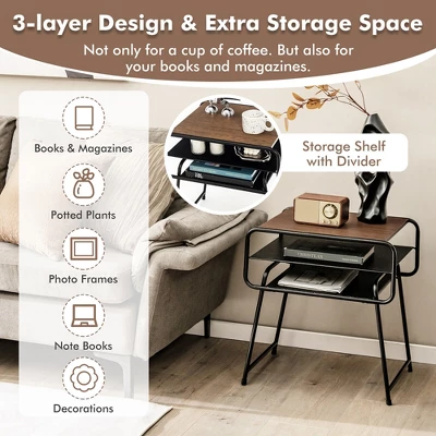 - Tidy Organized Storage: The couch snack table comes with 3 independent tiers and each one is wide enough to accommodate various items. The first layer is perfect to display exquisite decorations, the second layer can be used to hold electronics and the third layer will help you keep favorite magazines handy.