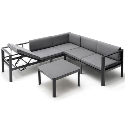 - [Modern Design for Anywhere]: No matter whether you want to place it on the patio, poolside, backyard or even indoors, this aluminum furniture set will always accept thanks to its modern design for versatile use. What’s more, the practical coffee table with premium tempered glass table makes usage more convenient.
