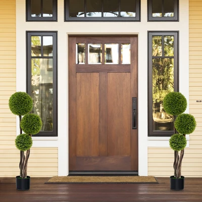 Bring vitality to your space with our faux topiary boxwood ball tree!The lifelike faux cypress tree features lush leaves, triple balls, 3 real wood trunks and vines, creating a stunning visual appeal that complements any environment. The fake topiary tree is crafted from PE material, ensuring that it is not only odorless and allergic-proof but also non-deformable. As the leaves are non-fading, the 4ft potted plant is suitable for indoor and outdoor use. The flower pot is thoughtfully weighted with cement to provide stability, keeping the tree securely in place.