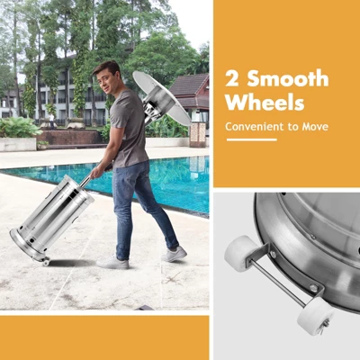 First, you need to start this patio heater. Do not worry, the operation is easy through the simple ignition system. And you can adjust the low or high heat settings by the heat control knob. After that, it is able to heat up to 25 feet because of its 48000 BTU output, heat-focusing reflective cover and flame emitter. During use, the tip-over protection and flameout protection will keep you safe. Moreover, the high quality stainless steel, base reservoir and ground fixers make this propane heater long-lasting and stable outdoors. What’s more, there are some considerate designs for your great convenience, such as a drink shelf table and 2 smooth wheels.