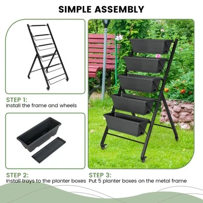 - Easy Installation & Ergonomic Design: This garden planter is easy to set up, and all you need to do is install the metal frame and wheels, install trays to the planter boxes, and then put 5 container boxes on the metal frame. And thanks to the detachable box design, you can work on your gardening ergonomically, reducing back pain.