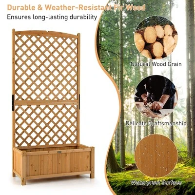- [Diamond Lattice Trellis]: The outdoor wooden planter is designed with a tall trellis, providing large space for growing climbing plants, hanging flower baskets and decorations. It is suitable for ivies, Morning Glories, grape vines, wisterias, and more. The diamond lattice design also makes the planter more charming.