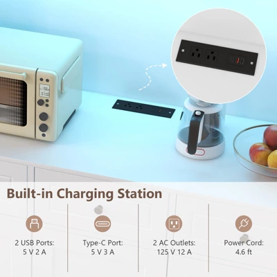 - Ultimate Charging Ease: This kitchen pantry cabinet features an integrated charging station, perfect for keeping all your devices powered and easily accessible. Cable management holes help maintain a tidy space, free from tangled wires. 2 USB ports: 5 V 2 A, Type-C port: 5 V 3 A, 2 AC outlets: 125 V 12 A, power cord: 4.6 ft/1.4 m.