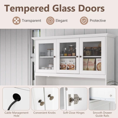 - User-friendly Features: Designed with your family’s safety in mind, this kitchen hutch comes with 2 anti-toppling devices to prevent tipping. The tempered glass doors add elegance and functionality, while the smooth drawer guide rails and convenient knobs ensure easy access to your belongings.
