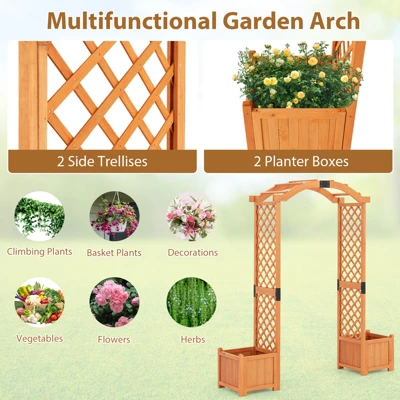 Create a captivating outdoor greenery oasis that reflects your style!Crafted from natural fir wood with water-based painting, the garden arch not only boasts longevity but also exudes a timeless charm that will enhance the overall appeal of your outdoor space. The outdoor pergola is designed with arched tops and climbing trellis, providing the perfect support for your basket plants and climbing vines. Equipped with 2 planters on either side, the garden arch allows you to indulge your green thumb. The planters are designed with drain holes to ensure proper water drainage, promoting healthy root growth. Also, the bottom panel can be removed for deep rooted plants to grow.