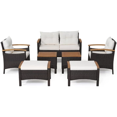 Create a space for outdoor relaxation and enjoyment with this 7-piece patio furniture set! The patio set consists of 1 loveseat, 2 single chairs, 2 ottomans and 2 side tables, providing ample seating area for 4-6 people to sit. With soft padded cushions, ergonomic backrests and curved acacia wood armrests, the single chairs and loveseat are comfortable enough for long time sitting. Likewise, the practical side table with solid acacia wood tabletop makes needed items within reach. And 2 ottomans with cushions will be the perfect space to relax your feet. You can use them as extra seats as well for great convenience.