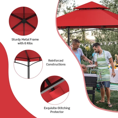 Enjoy Your Happy Outdoor BBQ Time with Our Grill Gazebo!The outdoor BBQ grill gazebo is ideal for providing shading and protection when enjoying outdoor grilling or cooking,allowing you to enjoy happy moments with your friends or family on weekends or holidays. It is designed with a vented double-tier top that offers smoke ventilation and adds stability. Besides,the canopy is made of high-quality polyester fabric that is not only characterized by great wear & tear resistance,ensuring long-lasting durability but also flame-retardant(please still keep all flame and heat sources away from the canopy for your safety).