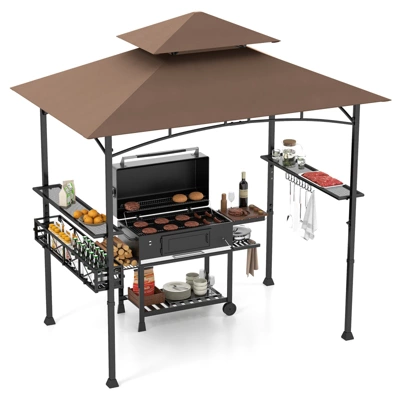 Turn Your Outdoor Grilling Sessions into a Luxurious Affair!Our grill gazebo features 40 sq.ft footprint, offering a spacious retreat for outdoor grilling. There are bar counters with 2 side shelves and a built-in bottle opener, allowing you to enjoy food comfortably around the gazebo. And it comes with a large storage basket and several hooks, keeping grilling essentials close at hand. Other than that, it boasts sun-protective and flame-resistant polyester canopy and rustproof metal frame, which is built to withstand various weather conditions, ensuring long-term outdoor use. And there is a double-tiered top and stake-fixed plates, making the gazebo more stable.