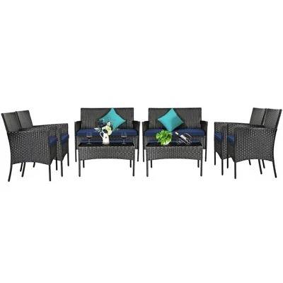 Our convenient 8-piece patio furniture set offers a relaxation zone for you, your family, or friends to enjoy outdoor leisure time. Constructed with all-weather PE rattan and a steel frame, the set guarantees durability and sturdiness for a long service life. The set includes a loveseat, a table, and two single chairs that can be arranged according to your preferences. Additionally, removable and washable seat cushions with zippers are provided for maximum comfort. The modern and classic appearance of this set complements any outdoor space, making it a perfect addition to your backyard, balcony, or poolside. If you are in search of an outdoor furniture set like this, do not miss out!