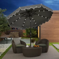 Elevate Outdoor Relaxation!Our patio umbrella measures 9.3 x 8.2 ft/283 x 250 cm (Dia. x H), perfect for creating a comfy shaded area outdoors, whether relaxing with family on the patio, hosting BBQ parties in the garden, or creating a shaded retreat by the pool. In the daytime, the push button tilt function helps block the sun from different directions. At nighttime, 32 LED lights evenly distributed on the umbrella ribs, powered by a solar panel for energy-saving illumination, provide a gentle ambient glow. Crafted with premium 180G polyester fabric, this umbrella offers exceptional protection against both sun and light rain.