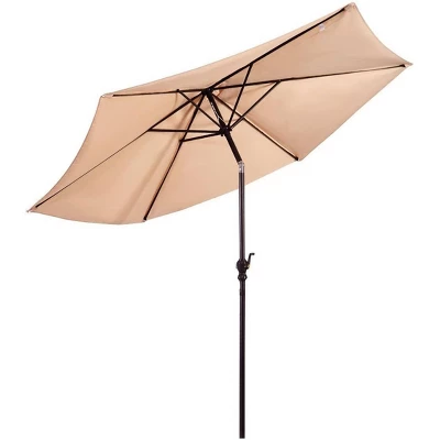 This is our 9ft patio umbrella which will be your ideal companion and can provide all-day shade enjoyment. Made of high-quality polyester cloth and supported by a steel pole and 6 sturdy ribs, our patio umbrella can withstand long-term outdoor use. You can open and close the umbrella effortlessly thanks to its handle crank. And push-button tilting system allows you to adjust the angle of the canopy to block the sun all day long. In addition, the round umbrella base with 50 lbs weight can hold your umbrella securely in place. Enjoy happy outdoor time under our patio umbrella with your family and friends!