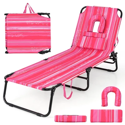 - Humanized Face Hole Design: The beach lounge chair is designed with detachable pillows and a face hole,allowing you to use your cell phone or read books and get your back tanned at the same time. And the pillows can be adjusted to meet your different needs. Besides,the face hole can also be covered by a detachable cloth.