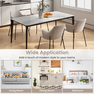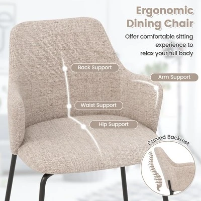 Looking for an ergonomic dining chair that offers a comfortable sitting experience? Look no further! Our specially designed dining chair features a comfy backrest, wide seat, and armrests that provide waist, hip, and arm support. The curved backrest is perfectly contoured to fit your body shape, ensuring optimal relaxation. Besides, the seat and backrest are filled with sponge for a cushioned support that is both gentle and invigorating. And the soft and breathable fabric adds an exquisite touch. Crafted with a stable metal frame and wear-resistant fabric, our dining chair is built to last. It offers sturdy and strong support, with a weight capacity of up to 330 lbs. Hence, it can withstand daily use and is perfect for any room in your home.