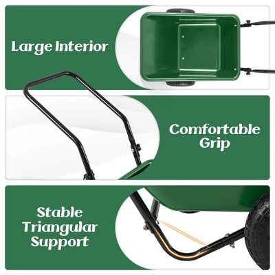 A Must-Have for All Your Gardening and Landscaping Needs!This rugged wheelbarrow boasts a remarkable weight capacity of 330 lbs and a generous 21 gal volume, which can be your go-to solution for transporting large quantities of materials effortlessly. The stability provided by dual reliable pneumatic tires, ensuring smooth navigation across diverse terrains. Besides, it adopts a heavy-duty metal frame and a crack-resistant PP bin, ensuring durability and longevity under demanding workloads. When not in use, the handle can be folded for space-saving storage. And the quick-release tilt design facilitates effortless dumping of contents, enhancing productivity during your outdoor tasks.