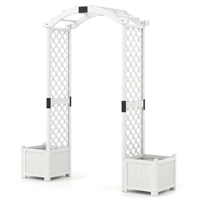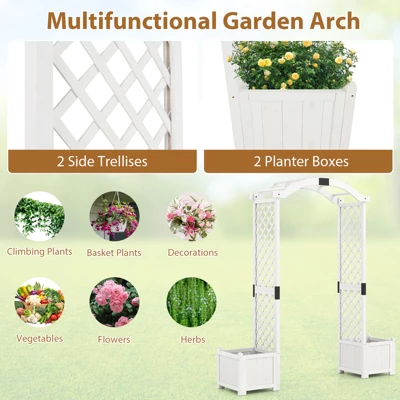 Create a captivating outdoor greenery oasis that reflects your style!Crafted from natural fir wood with water-based painting, the garden arch not only boasts longevity but also exudes a timeless charm that will enhance the overall appeal of your outdoor space. The outdoor pergola is designed with arched tops and climbing trellis, providing the perfect support for your basket plants and climbing vines. Equipped with 2 planters on either side, the garden arch allows you to indulge your green thumb. The planters are designed with drain holes to ensure proper water drainage, promoting healthy root growth. Also, the bottom panel can be removed for deep rooted plants to grow.