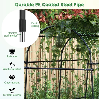 - long-lasting PE Coated Metal Pipe: Made of PE coated metal pipes with plastic coating and metal interior, the garden trellis is rust-proof, weather-resistant, and crack-resistant for a long lifespan. The metal pipes are fastened together by galvanized sure clips, which increases the strength of the structure.